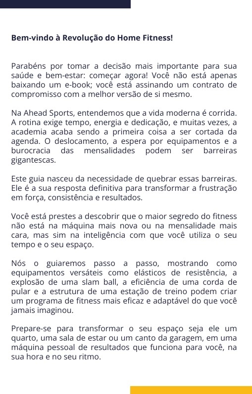 Desenvolvido pela Ahead Sports, este e-book mostra que o segredo do fitness não está em máquinas sofisticadas, mas na forma inteligente de usar seu tempo, seu espaço e seu corpo. Você aprenderá como montar treinos eficientes utilizando equipamentos versáteis, com métodos simples, adaptáveis à sua rotina e ao seu ritmo.