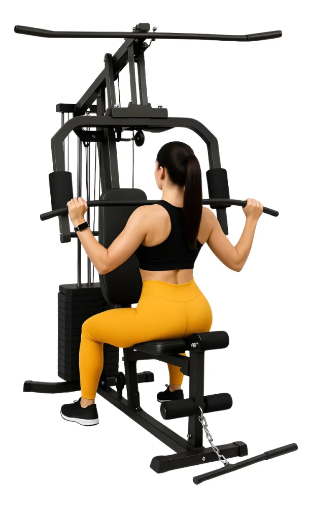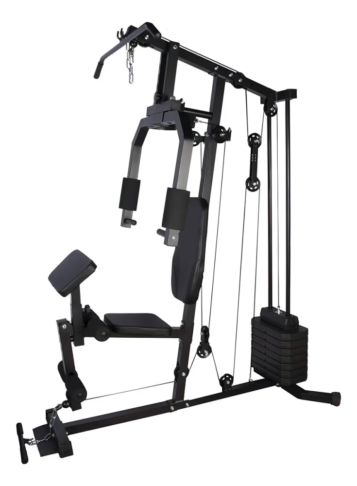 A Estação de Musculação Bonafit 45 kg permite realizar mais de 24 exercícios, trabalhando braços, peitoral, ombros, costas, pernas e abdômen. Ideal para treinos de força e condicionamento, possui supino, crucifixo, puxadas, rosca, tríceps, extensora e flexora de pernas, garantindo um treino completo em casa.