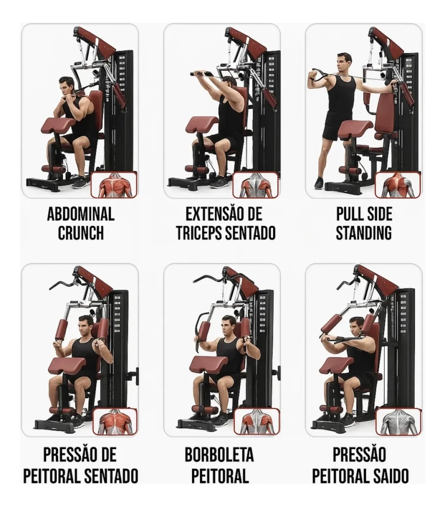 Permite treinos de peito, costas, pernas, ombros, braços e abdômen.