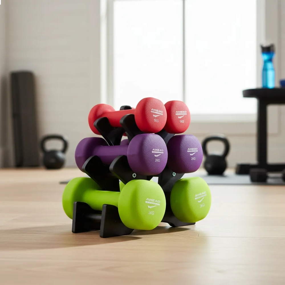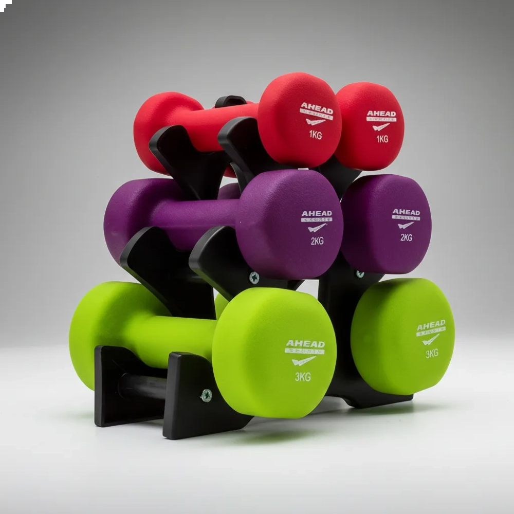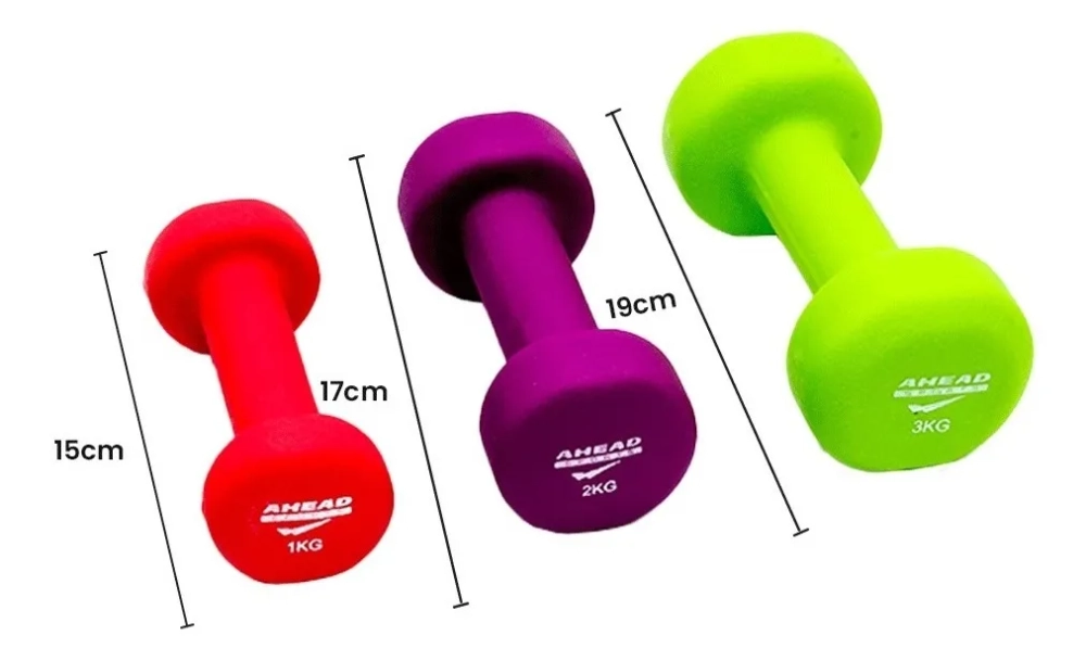 Halteres Ahead Sports para treino seguro e eficiente, com acabamento emborrachado e textura antiderrapante. Ideal para fortalecer músculos e acelerar o metabolismo. O kit inclui 6 halteres (1 kg, 2 kg, 3 kg) e suporte plástico resistente.