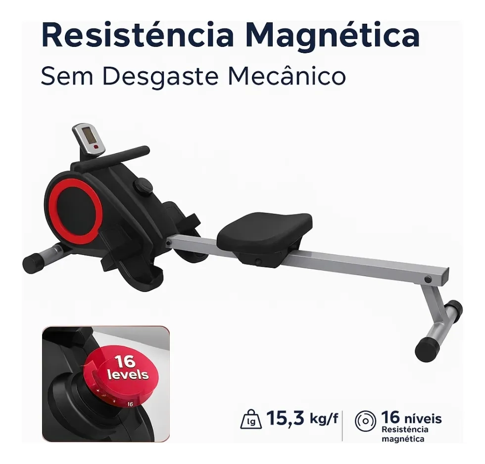 Remo Indoor Magnético – treino completo, silencioso e sem impacto, ideal para todos os níveis e idades (8 a 80 anos). Proporciona exercício integrado para pernas, abdômen, glúteos, costas, peitoral e braços, com baixo risco de lesões. Conta com sistema de resistência magnética ajustável em 16 níveis, transmissão por correia silenciosa, e display LCD que mostra tempo, calorias e remadas. Estrutura em metal, suporta usuários até 185 cm e pesa 24 kg. Dimensões: 166x45x57 cm. Garantia de 3 meses.